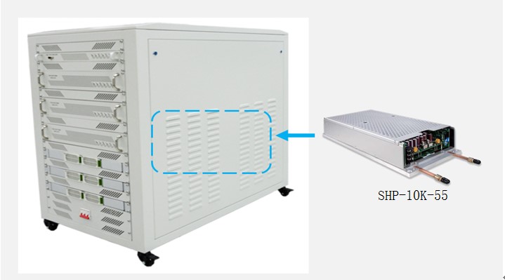 如圖三是將SHP-10K-55安裝在固態(tài)微波源的設備內(nèi),提供非常穩(wěn)定的直流電壓能量給功率級微波能量線路,系統(tǒng)提供可控且精準的微波能量給相關設備使用,如工業(yè)微波加熱設備、工業(yè)微波干燥設備、微波等離子體設備等。