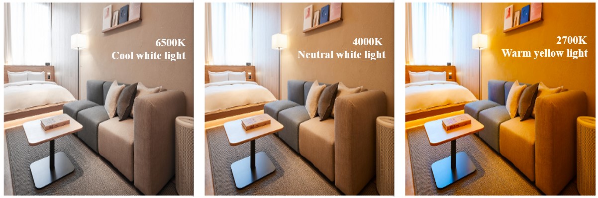 單一色溫的燈具并不能同時(shí)滿足人們的生活和工作需要,人們對(duì)光溫的需求會(huì)依不同的時(shí)間段而不一樣。如下圖二酒店房間照明,在白天,冷白光或中性白光更適合于閱讀和交流;到了晚上,溫暖的光可以緩解身心疲憊,改善睡眠質(zhì)量。因此,以色溫可調(diào)的LED燈具將會(huì)越來(lái)越廣泛應(yīng)用于住宅、酒店、辦公和其他商業(yè)照明場(chǎng)合,以提供個(gè)性化照明,滿足不同時(shí)段需求。