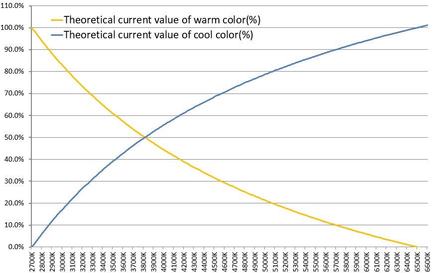 可調(diào)色溫和亮度的LED燈具,內(nèi)部是采用了冷、暖色溫兩路光源輸出,如下圖三,一路為冷光(6500K),一路為暖光(2700K),每一路相對(duì)獨(dú)立。如下圖四,透過(guò)調(diào)設(shè)每一路光源驅(qū)動(dòng)電流的比例,可以實(shí)現(xiàn)色溫調(diào)設(shè);在一定色溫條件下,同比例改變兩路光源驅(qū)動(dòng)電流的大小,可以實(shí)現(xiàn)亮度調(diào)設(shè)。