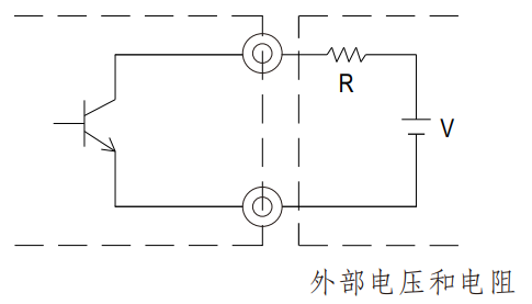 以下為一簡易外部線路外加一直流電壓源 V 與限流電阻 R: (最大供電電壓為 50VDC,最大吃載電流為 30mA)